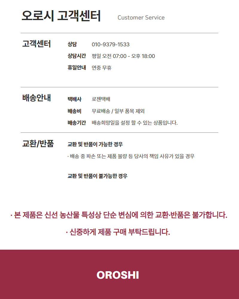- 본 상품의 거래는 (주)오로시의 일반 약관에 따릅니다. 자세한 내용은 사이트 하단의 이용약관을 참고해주세요.